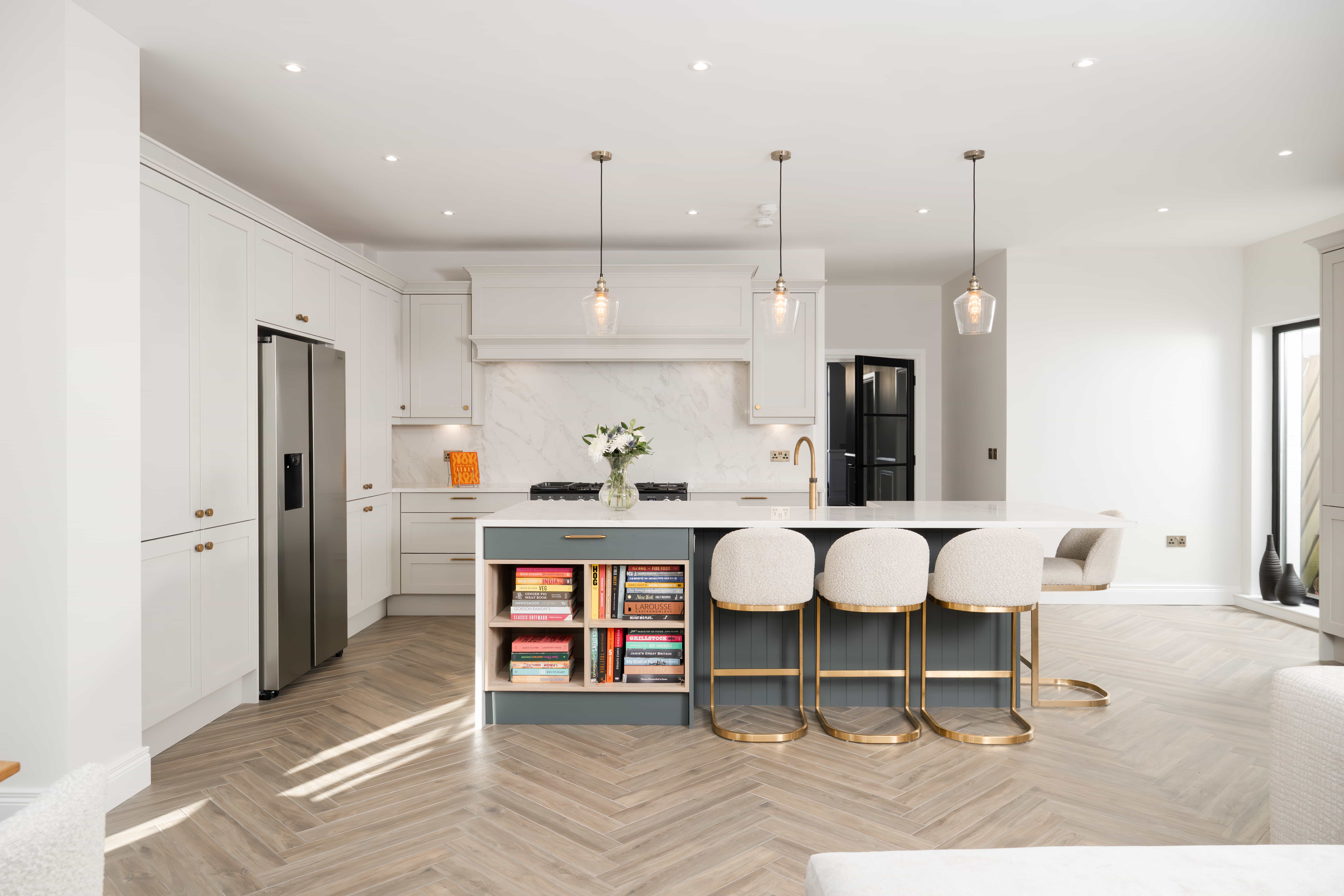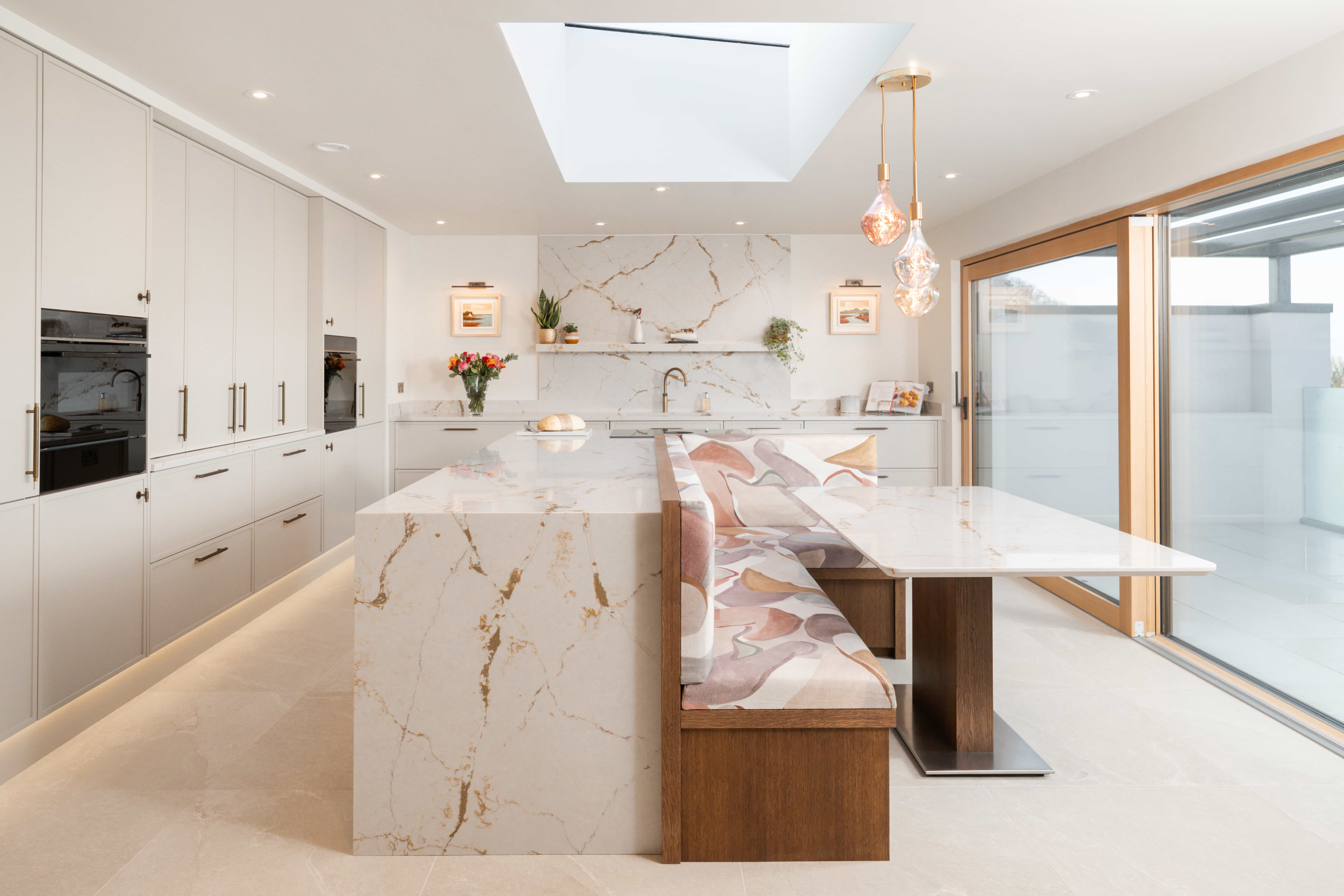 Fitted kitchen in Belfast with custom island, integrated dining area and bespoke cabinetry designed by Interior360